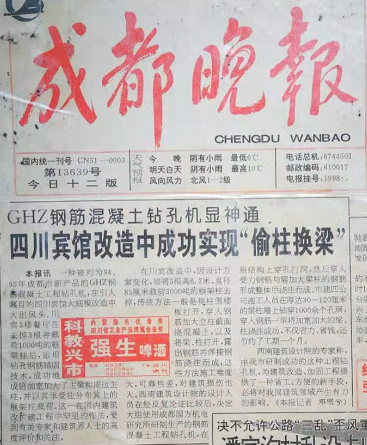 1995年在四川總府皇冠假日酒店成功的進(jìn)行了托梁換柱,3根主梁的跨度由15.6米增加到23米,這種國(guó)內(nèi)高層建筑改擴(kuò)建工程的罕見(jiàn)做法,至今未被打破,受到業(yè)內(nèi)人士高度評(píng)價(jià)和關(guān)注。